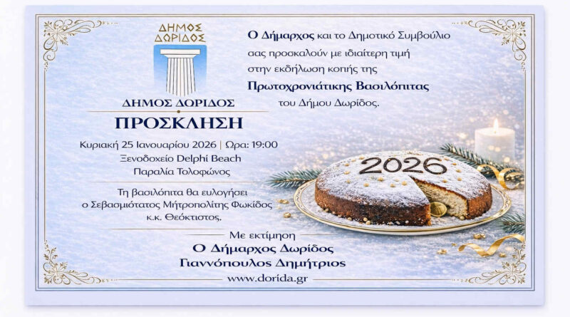 Δήμος ΔωρίδαςΕπικαιρότηταΤοπικά Κοπή πρωτοχρονιάτικης πίτας Δημου Δωριδας 20 Ιανουαρίου, 202620 Ιανουαρίου, 2026 econtent 174 Views