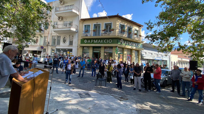 Χαιρετισμό στη συγκέντρωση της Χαλκίδας απηύθυναν ο Γιάννης Βαρσαμας, πρόεδρος του Σωματείου της ΦΑΜΑΡ, και ο Άρης Αυξωνίδης, πρόεδρος του ΝΤ Εύβοιας της ΑΔΕΔΥ.