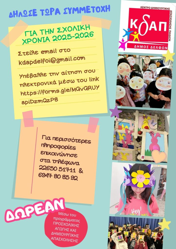 Ο Δήμος Δελφών συνεχίζει, για μια ακόμα χρονιά, την επιτυχή λειτουργία των Κ.Δ.Α.Π. στα σχολεία του Δήμου, συμμετέχοντας στο πρόγραμμα «ΠΡΟΩΘΗΣΗ ΚΑΙ ΥΠΟΣΤΗΡΙΞΗ ΠΑΙΔΙΩΝ ΓΙΑ ΤΗΝ ΕΝΤΑΞΗ ΤΟΥΣ ΣΤΗΝ ΠΡΟΣΧΟΛΙΚΗ ΕΚΠΑΙΔΕΥΣΗ, ΚΑΘΩΣ ΚΑΙ ΓΙΑ ΤΗΝ ΠΡΟΣΒΑΣΗ ΠΑΙΔΙΩΝ ΣΧΟΛΙΚΗΣ ΗΛΙΚΙΑΣ, ΕΦΗΒΩΝ ΚΑΙ ΑΤΟΜΩΝ ΜΕ ΑΝΑΠΗΡΙΑ, ΣΕ ΥΠΗΡΕΣΙΕΣ ΔΗΜΙΟΥΡΓΙΚΗΣ ΑΠΑΣΧΟΛΗΣΗΣ» για τη σχολική χρονιά 2025-2026.