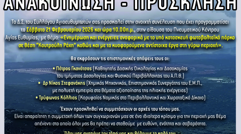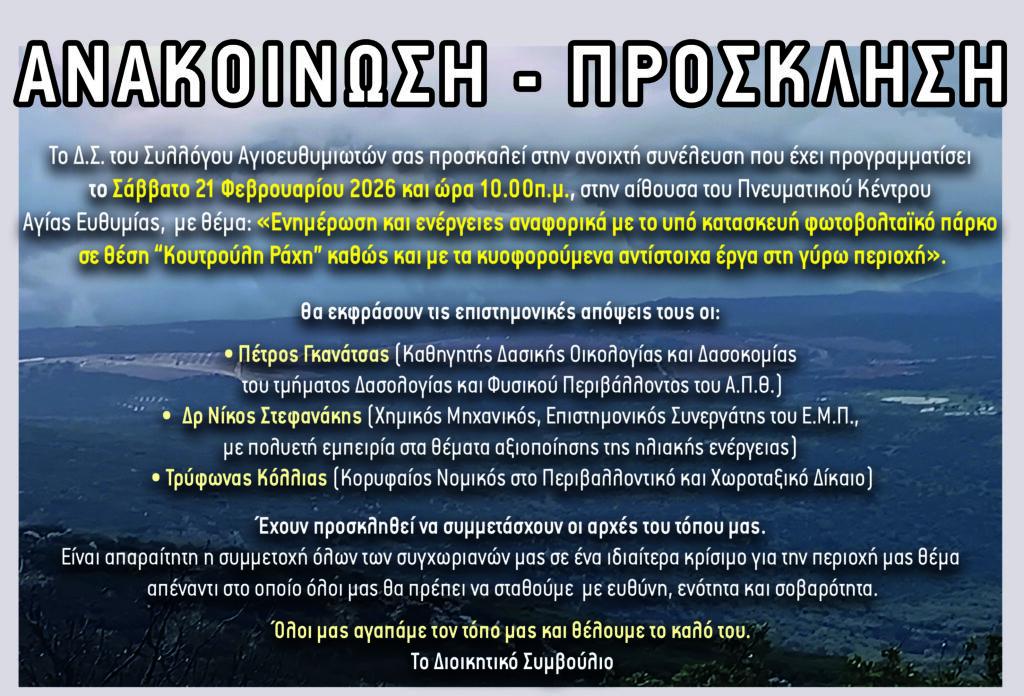 ΕπικαιρότηταΚοινωνικοί ΦορείςΤοπικά Σε ανοιχτή συνέλευση το Σάββατο καλεί ο σύλλογος Αγιοευθυμιωτων 19 Φεβρουαρίου, 202619 Φεβρουαρίου, 2026 econtent 150 Views