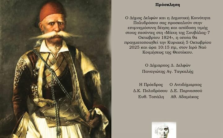 Ο Δήμος Δελφών και η Δημοτική Κοινότητα Πολυδρόσου προσκαλούν στην επιμνημόσυνη δέηση και απόδοση τιμής στους πεσόντες στη «Μάχη της Σουβάλας-7 Οκτωβρίου 1824», η οποία θα πραγματοποιηθεί την Κυριακή 5 Οκτωβρίου 2025 και ώρα 10:15 πμ, στον Ιερό Ναό Κοιμήσεως της Θεοτόκου.