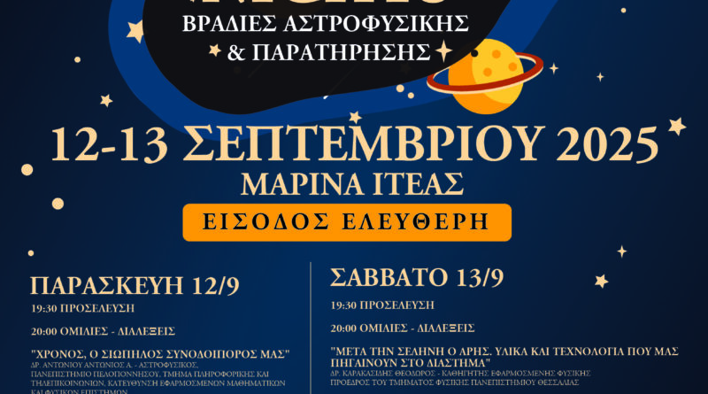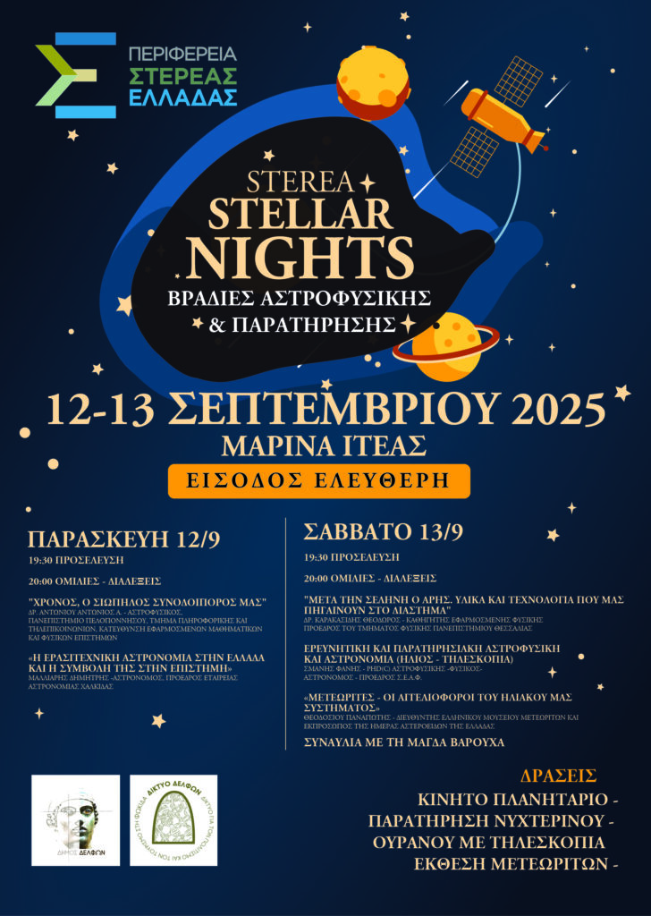 H Περιφέρεια Στερεάς Ελλάδας, σε συνεργασία με τον Δήμο Δελφών και τη Δημοτική Ενότητα Ιτέας, διοργανώνει το 4o Φεστιβάλ Αστροφυσικής και Παρατήρησης Νυχτερινού Ουρανού. Το Φεστιβάλ θα πραγματοποιηθεί το διήμερο 12 και 13 Σεπτεμβρίου στην Μαρίνα Ιτέας.